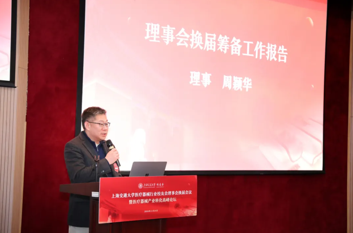 第二届理事会执行会长华平做第二届理事会工作报告,并回顾了医疗器械行业校友会三年来的工作。周颖华做新一届理事会换届筹备工作报告,并对行业校友会理事会换届筹备组表示感谢。