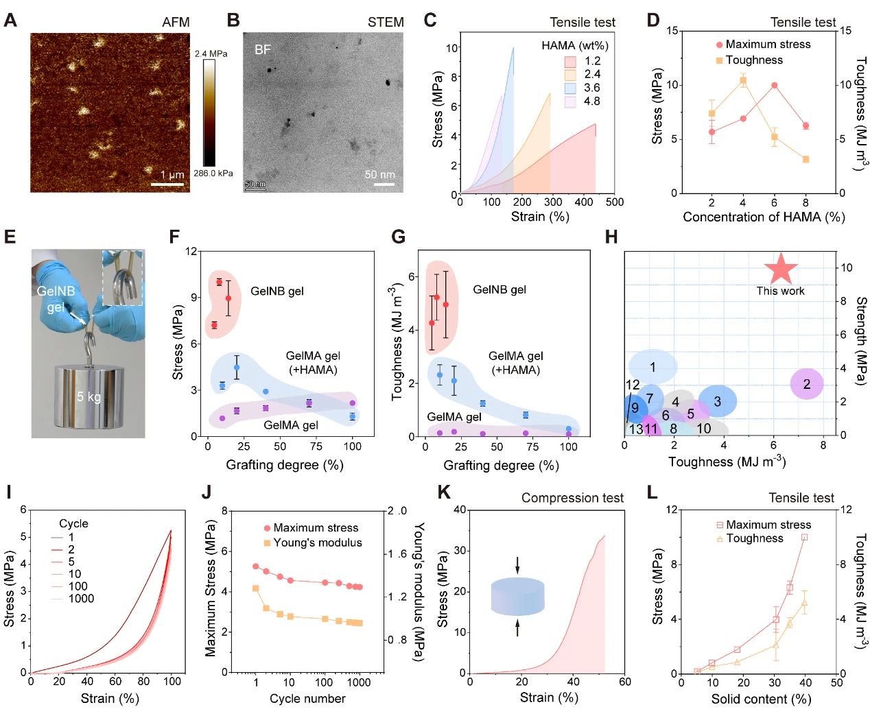 在此基础上,研究团队选用透明质酸作为分相结构中的硬相,形成类似纳米复合材料的微观结构,并借助纳米增强效应提升明胶水凝胶的力学性能。这一选择基于透明质酸出色的生物相容性和完全可生物降解性。团队将邻硝基苄醇改性的明胶(GelNB)、少量甲基丙烯酸化透明质酸和光引发剂混合制备成前体溶液,在395 nm光照射下制备明胶水凝胶(GelNB凝胶)。通过原子力显微镜和电子显微镜等表征手段,证实了透明质酸聚合后形成的高密度颗粒。当其含量为3.6%时,GelNB水凝胶的拉伸强度达到10 MPa,展现了惊人的力学性能。