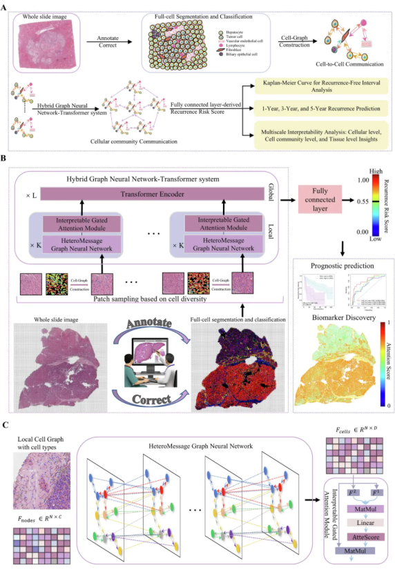 2025年7月25日,日本女优 金成团队在《npj Precision Oncology》发表研究成果,提出了一种结合细胞图神经网络与Transformer的新型AI架构——Hybrid Graph Neural Network-Transformer system (HGTs),该系统首次实现了全切片级别的细胞实例分割与分类识别,并精准预测肝细胞癌(HCC)患者术后局部复发风险。该研究基于387例HCC患者、6个独立队列、57位临床病理专家协助完成,展示了人工智能在多尺度肿瘤异质性建模与空间生物标志物发现中的巨大潜力。传统像素级视觉处理方法难以捕捉数百万级细胞实体在肿瘤组织中的复杂部署与形成策略。HGTs系统突破性地实现了从细胞-细胞、细胞-群体,到组织层级的多尺度交互建模,显著优于现有SOTA方法,在融合临床与IHC信息后,C-index达到0.823,较基线提升23.1%。该研究还发现并量化了一组空间关系标志物,如肿瘤-淋巴细胞交互频率、关键细胞群体的稀疏度与分布模式、以及瘤周组织的纤维化程度等,揭示了其对复发风险的决定性作用,并初步探索了该标志物组合的免疫治疗潜力。