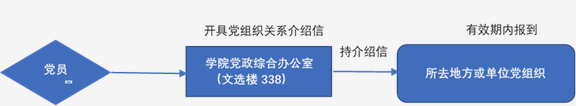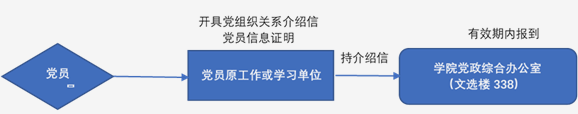 新入职教职工党员持原工作或学习单位党组织开具的组织关系介绍信与党员信息证明,到学院党政综合办报到并办理相关转入手续。