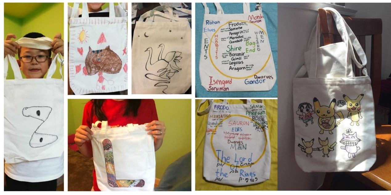 王老师一边画一边耐心地给小朋友讲述绘画要点,首先准备好专用的布艺绘画笔,然后用细细的黑色勾线笔先后勾勒出图案的外部和内部轮廓,最后细致、均匀地涂色。孩子们一边专心听讲,一边认真实践。