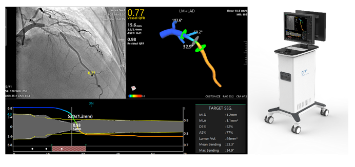涂圣贤团队研制了一种基于冠脉影像评估血管生理功能的定量血流储备分数检测仪。系统可安装在医院介入导管室,通过网络获取导管室造影机采集的造影影像或血管内成像影像,实现快速冠状动脉三维重建与血流储备分数计算(含QFR、OFR与UFR),用于在线判断重建血管的解剖参数与功能缺血状况,以优化支架植入手术。