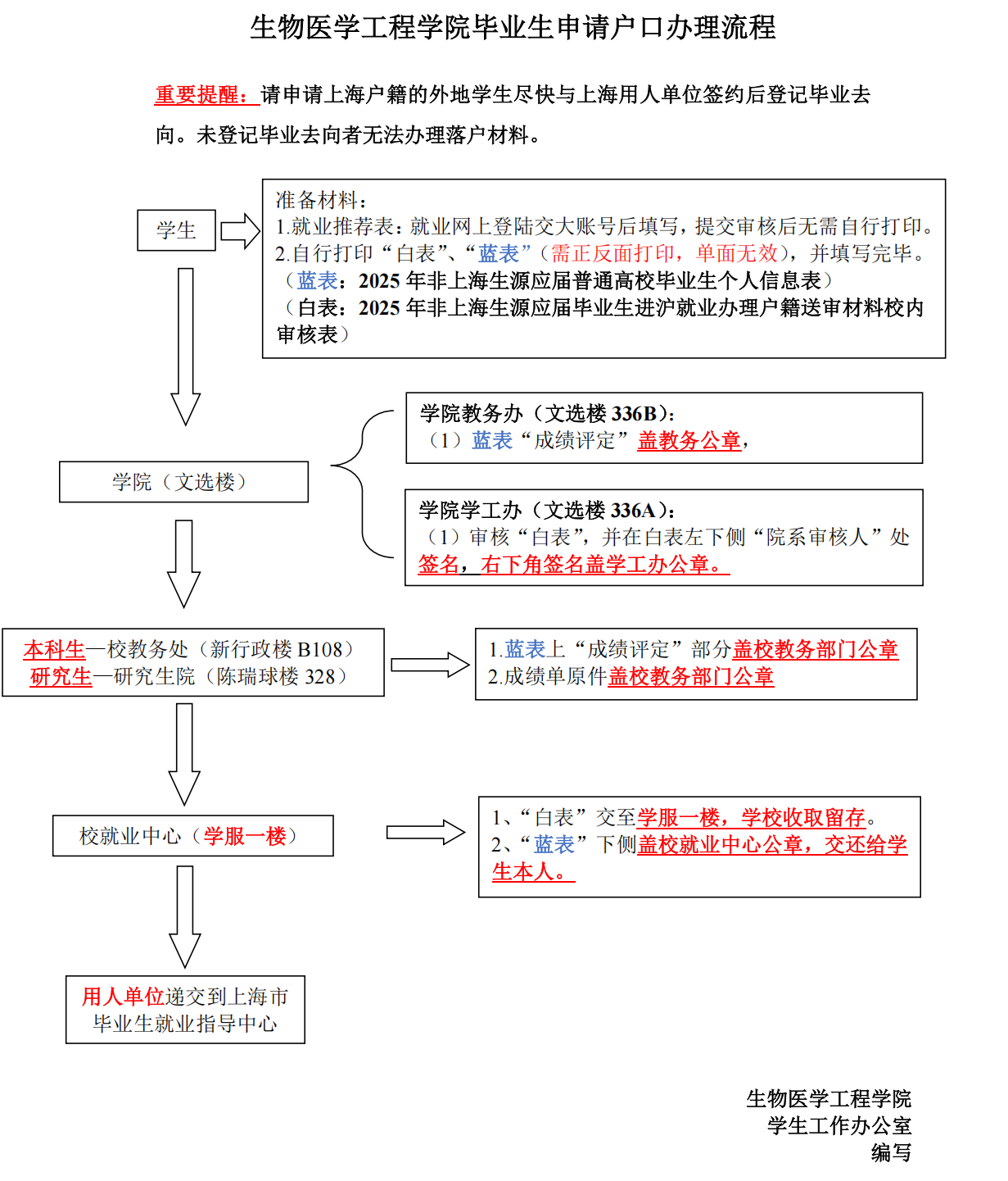 根据上海市教育委员会、上海市发展和改革委员会、上海市人力资源和社会保障局和上海市公安局联合发布的《关于做好2025年非上海生源应届普通高校毕业生进沪就业工作的通知》的文件精神,现将落户材料的校内办理流程整理如下,供同学们参考。流程详解、材料填写模板可参考: