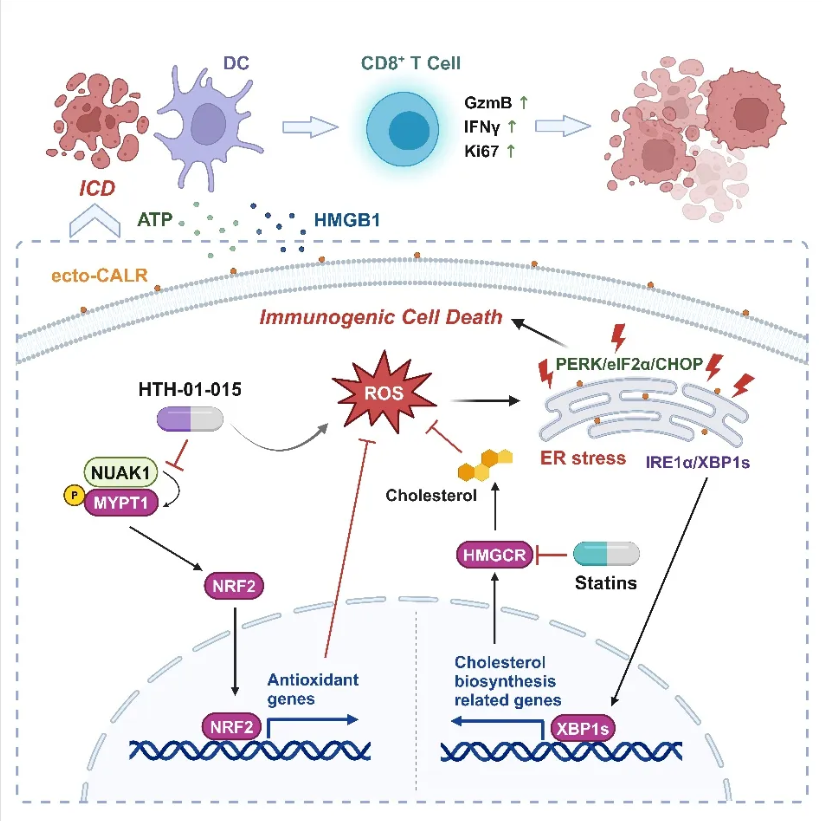 研究团队首先通过全激酶组范围的 CRISPR-Cas9 敲除筛选,发现NUAK1 的抑制会引发肿瘤ICD,此效应依赖于活性氧(ROS)的积累和内质网应激(ER stress)的产生。ROS的积累则是由于 NUAK1下游NRF2 介导的抗氧化基因表达下调所致。NUAK1抑制的体内抗肿瘤功效依赖于T细胞免疫。对NUAK1阻断的分子作用机制的进一步分析还发现,由 ICD 诱导的内质网应激下游的 XBP1s 所激活的甲羟戊酸途径/胆固醇生物合成,起到了负反馈机制的作用。通过 CRISPR 敲除或 HMGCR 抑制剂辛伐他汀靶向甲羟戊酸途径,可以增强 NUAK1 抑制介导的 ICD 和抗肿瘤活性。体外实验结果显示,胆固醇的抗氧化特性可以抑制ROS的生成,从而影响NUAK1抑制剂诱导的细胞死亡。给予小鼠高胆固醇饮食会削弱NUAK1抑制剂的抗肿瘤效果。