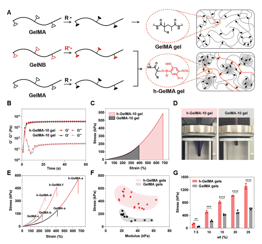在再生医学与组织工程的前沿领域,科学家们一直在寻找能够模拟人体组织环境、支持细胞生长并最终构建健康组织的理想材料。明胶水凝胶(以甲基丙烯酸化明胶,即GelMA为代表)因其优异的生物相容性、可降解性以及天然促进细胞黏附的特性而备受青睐。然而,随着应用需求不断提升,传统GelMA在力学性能上的“短板”愈发凸显:尽管在实验室条件下“养细胞”得心应手,但在高负载压力或对结构精度要求严苛的应用场景(如复杂组织构建和高精度3D生物打印)中却显得力不从心,如同体质羸弱的选手难以胜任“重量级”赛事。这一限制不仅降低了明胶水凝胶在构建复杂生物结构时的稳定性和可靠性,也阻碍了其从实验室向临床与产业应用的推进。