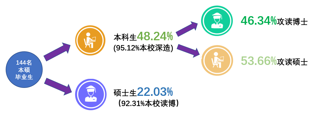 本科毕业生共有85位,其中41位选择国内升学。在这41位继续深造的学生中,37位选择留在本校深造,包括22位攻读硕士的同学和19位攻读博士的同学。