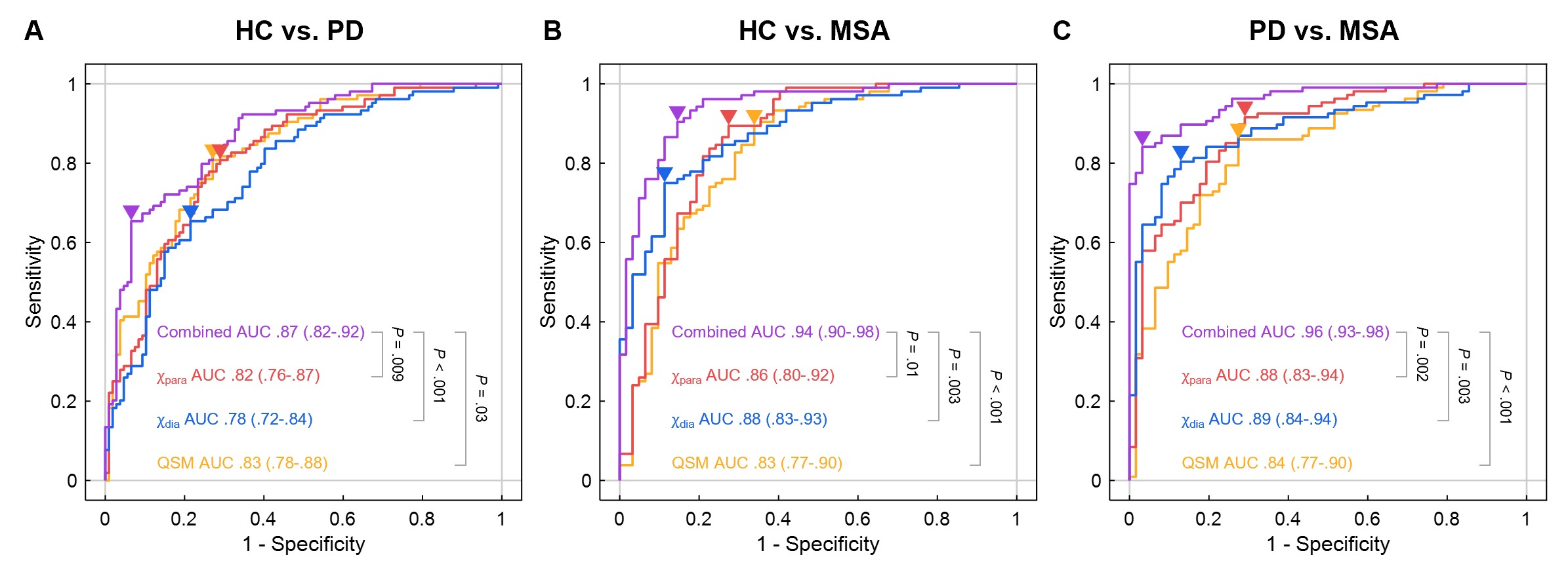 信号取得了0.87的曲线下面积(AUC)。在区分MSA患者与HC时,联合使用χpara